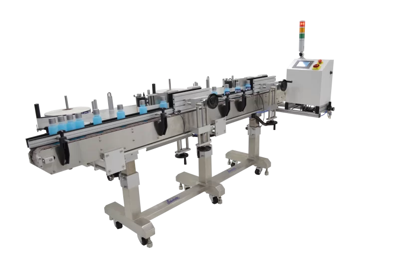 The APS-206 is economical, self-contained and easy to operate. This automatic labeling system comes equipped with a 10 ft. variable speed conveyor. Additional features include, stepper motor driven label dispenser, take up reel and label tampers. The easy to use design makes it simple to change bottle and label sizes. APS-206 can handle up to 6” tall labels. The APS-206 switches to the second label head when the first label head runs out of labels. Labels can be loaded on the first label head without stopping the machine.