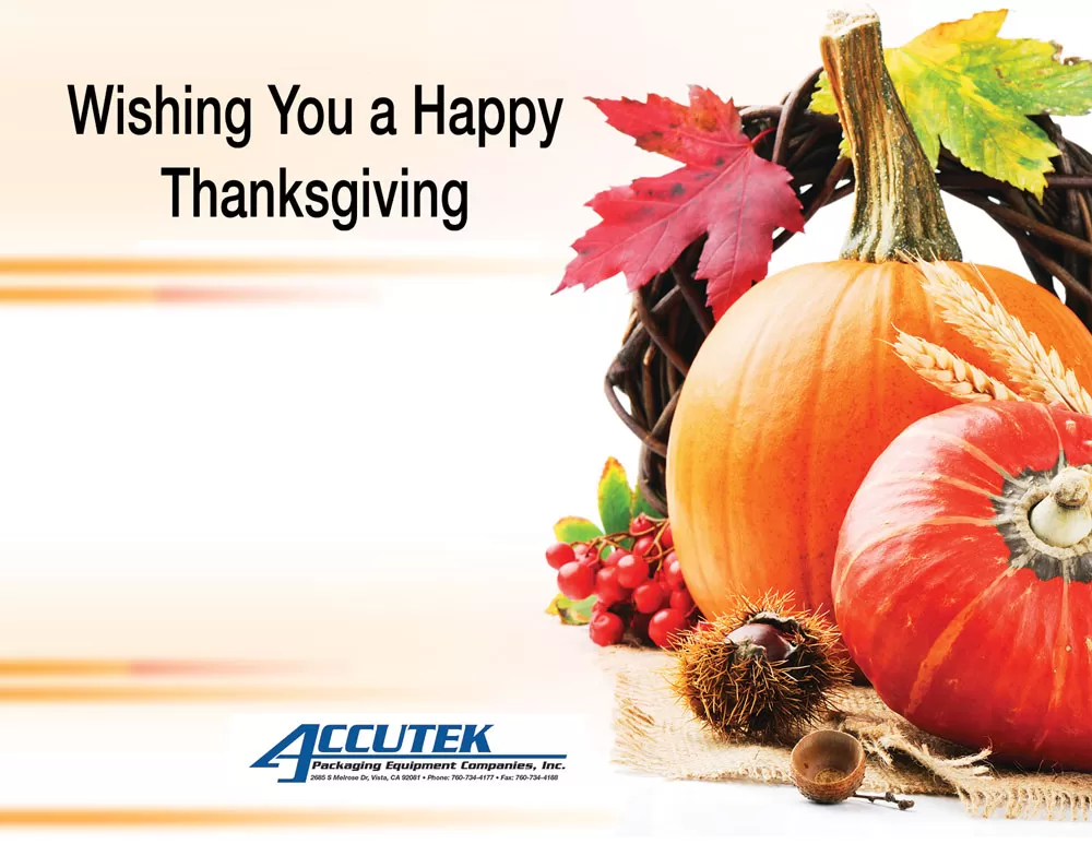 Accutek Packaging Equipment Companies will be closed on Thursday November 24th & Friday November 25th for Thanksgiving. We will re-open on Monday, November 28th, at normal business hours.