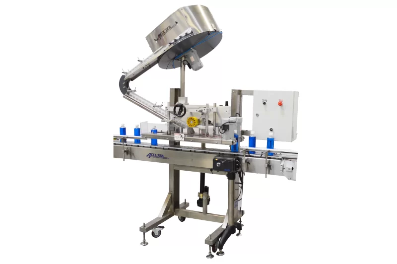 The Auto AccuCapper feature an Accutek centrifugal bowl or cap elevator orientator. With an automated delivery device, the Accutek Snap Capper can reach speeds up to 120 CPM.