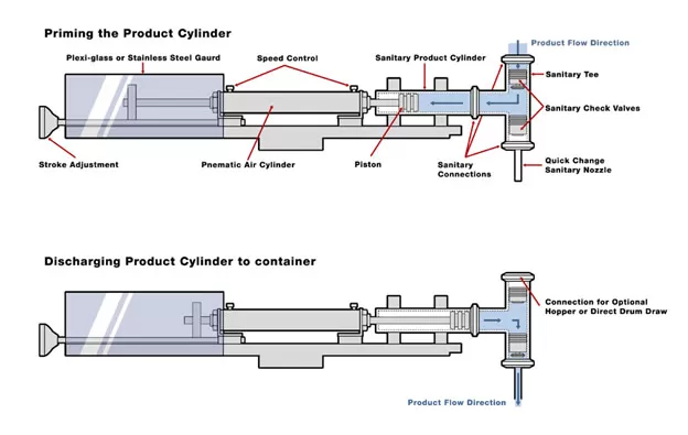 Accutek piston volumetric filling machines are accurate within ± 0.5% when operated as recommended. Piston filler dose size is dependent on product cylinder inner diameter and piston travel distance. On the intake stroke the piston draws product from the supply source through the upper check-valve. On the return stroke the product flows through the lower check-valve to the nozzle.