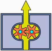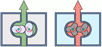 This type of gear pump has two or three lobes on each shaft. The lobes nearly touch each other in the center, forming a tight seal. They also nearly touch the casing. As the lobes rotate they move fluid around the outer edge of the pump to the discharge port.