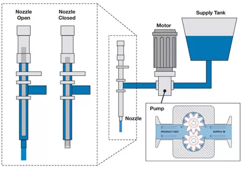 Different types of products require different nozzle designs. The nozzle used to fill an ampule with 10 ml of thin fluid would not be appropriate for filling a five-gallon can with paint. There are numerous sizes and shapes of nozzles available between these two extremes.