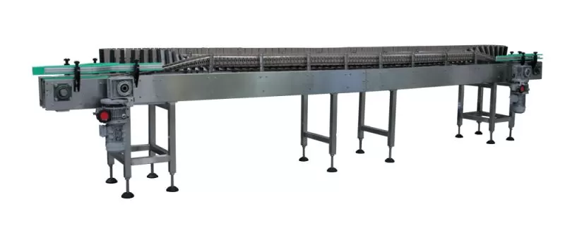 Accutek’s Inversion Sterilizing Conveyor is a crucial system for sanitation of inner bottle and cap surfaces when filling hot beverages. The sterilizing conveyor automatically inverts containers 90° in order to utilize the products high temperature to disinfect the bottle mouth and cap without any additional heat source. Containers are then automatically returned to an upright positions for cooling and further packaging. Universal cleat design accommodates a wide range of container dimensions and shapes.